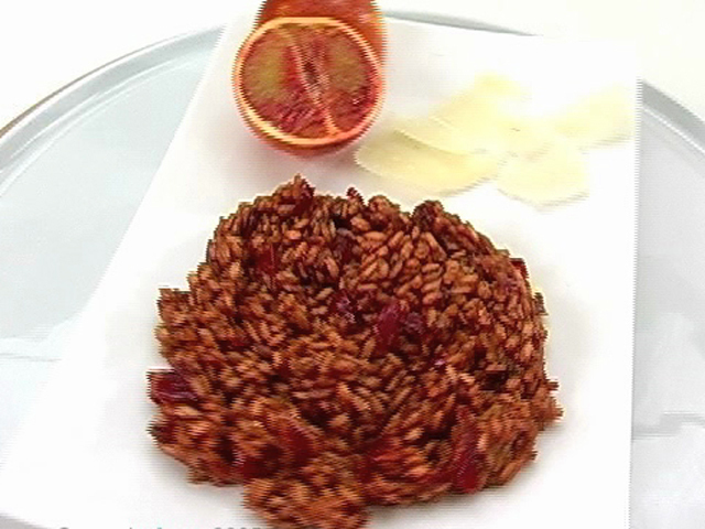 Кухня Северной Италии на вашем столе.Состав:рис — 1 стакан;лук — 1/2 штуки;сыр — 100 гр;мясной бульон — 2 стакана;сок восьми апельсинов;масло — 70 гр.